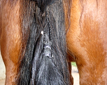 In den meisten Fällen empfiehlt sich die Befestigung direkt unterhalb der Schweifrübe, da sich das Toupet hier besonders gut im natürlichen Schweif verbirgt.